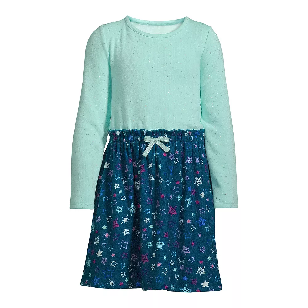 A cozy fleece construction makes this girls’ Lands’ End dress a comfy and cute choice.