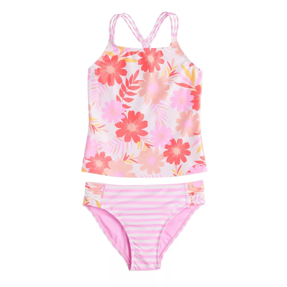 She’ll love the cute look of this girls’ SO Twin Print Tankini Top & Bottoms Swimsuit Set.