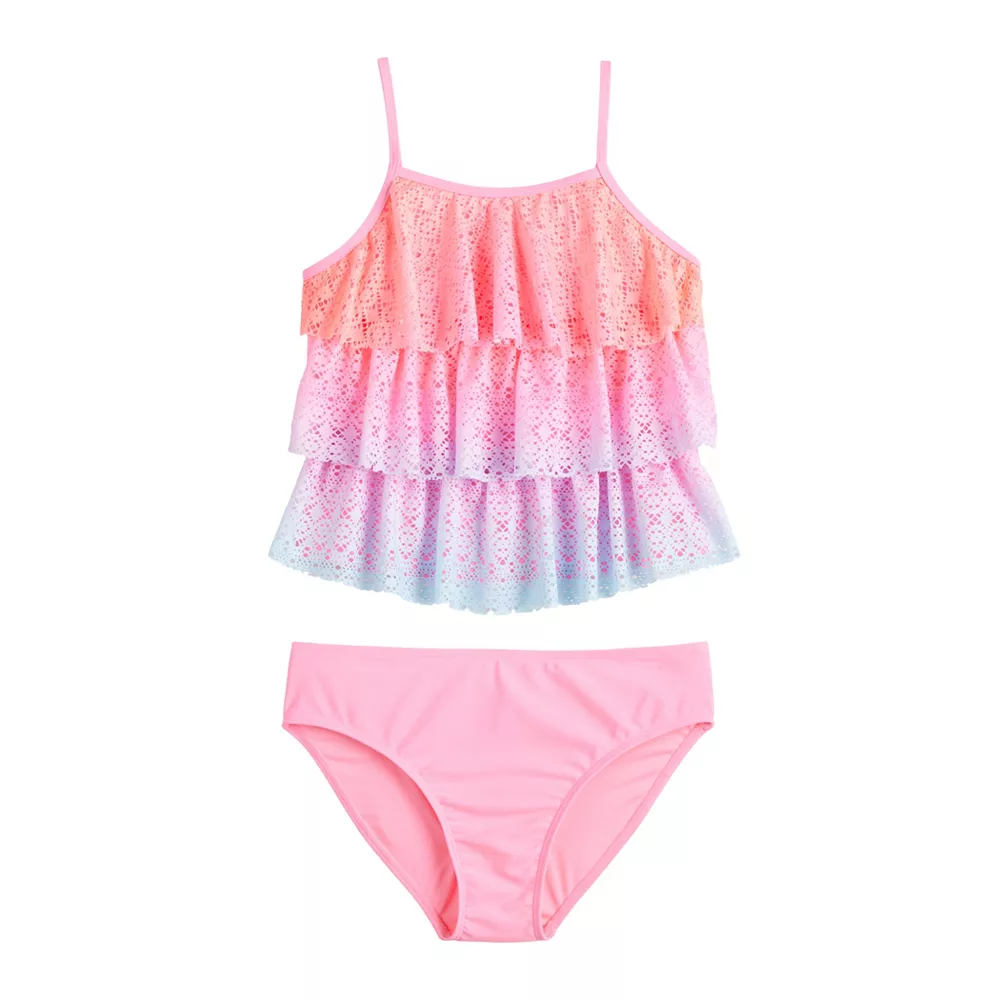 A ruffled front makes this girls’ SO tankini top and bottoms swimsuit set a playful choice for beach or pool days.