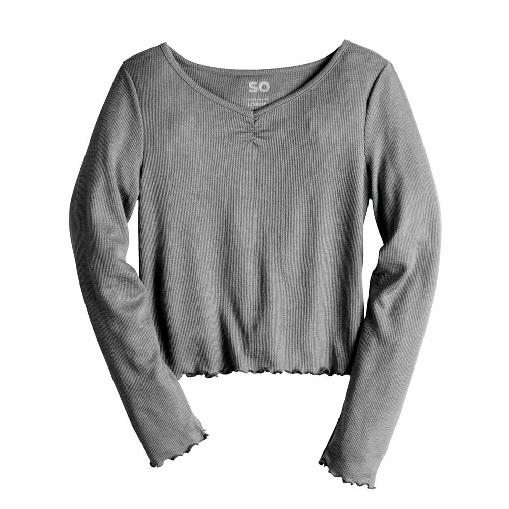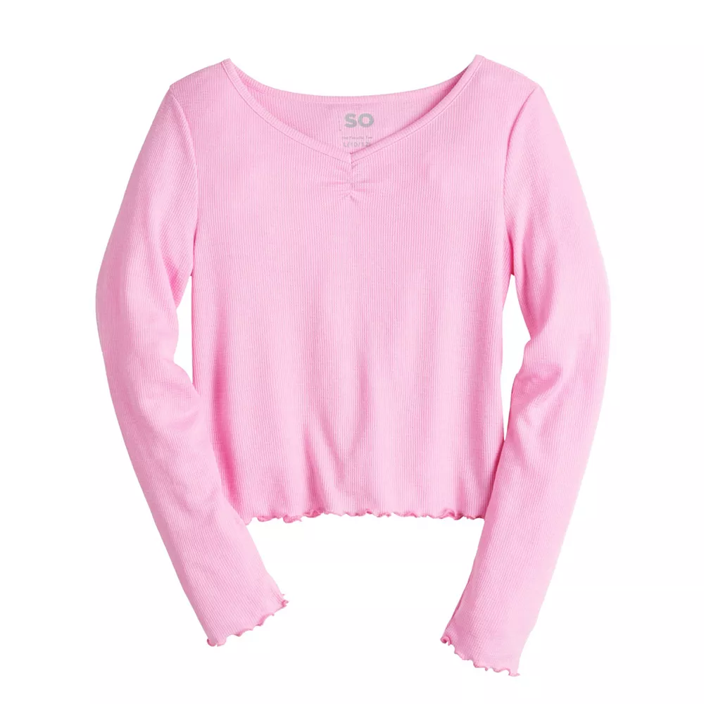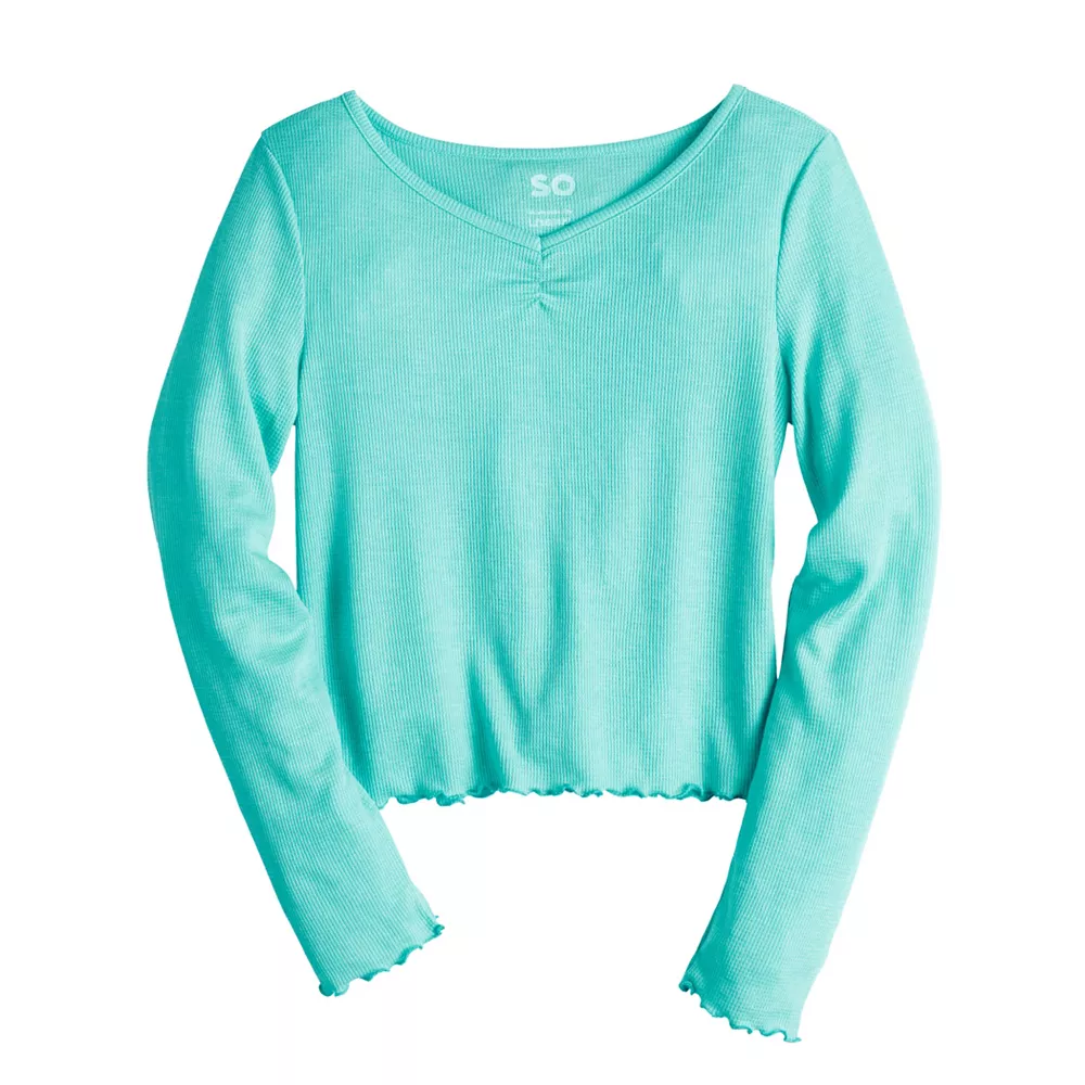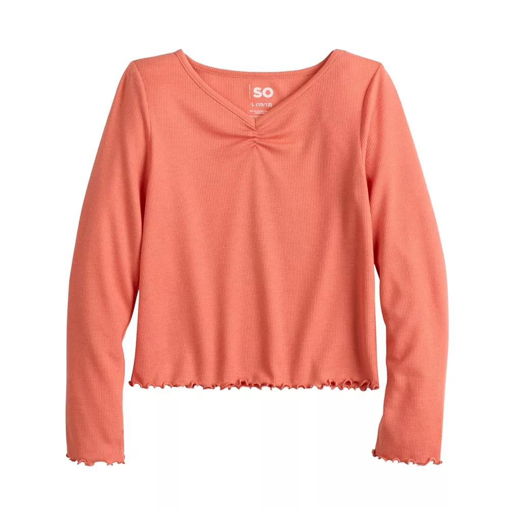 Sweet and simple style is effortless with this girls’ SO cinch-front, lettuce-hem top.