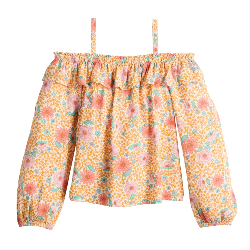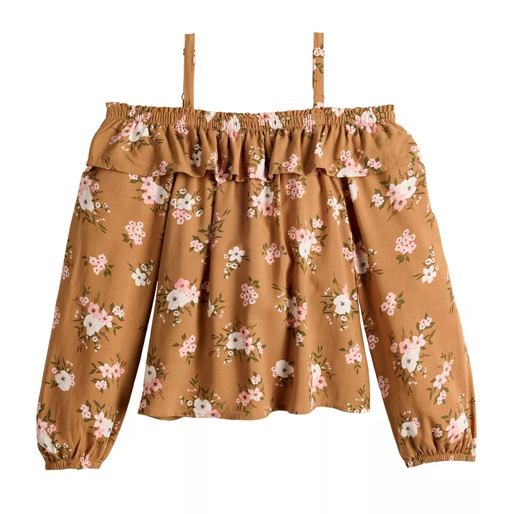 Ruffled details give this girls’ SO off-the-shoulder top feminine charm she’s sure to love.