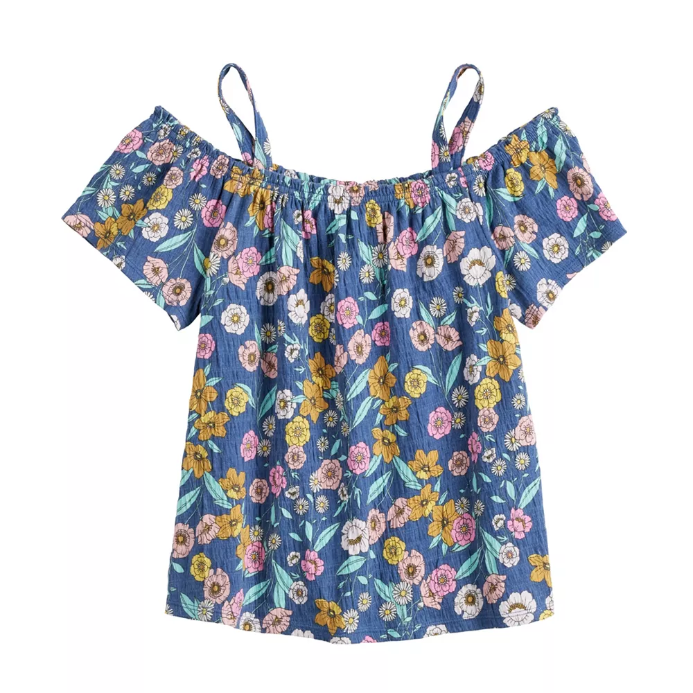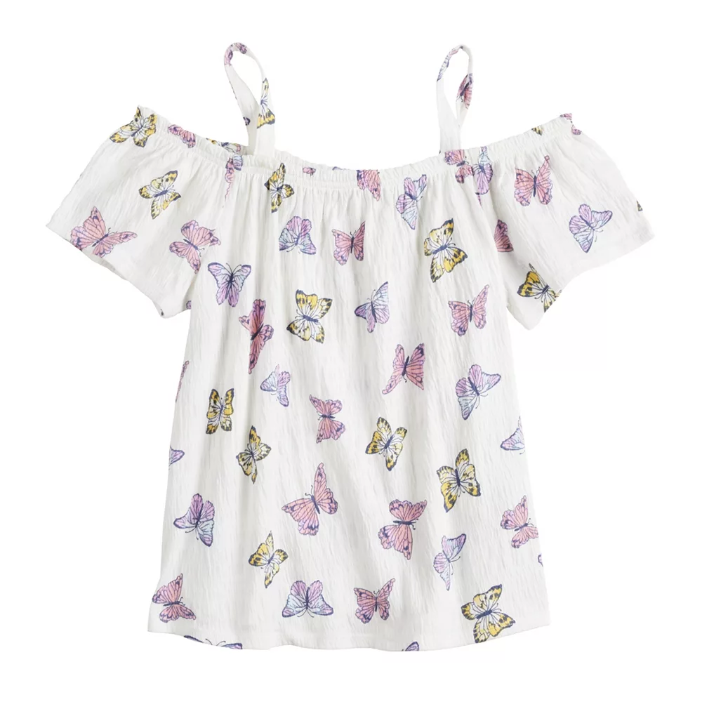 An eye-catching off-the-shoulder design gives this girls’ SO swing top stand-out style she’s sure to love.