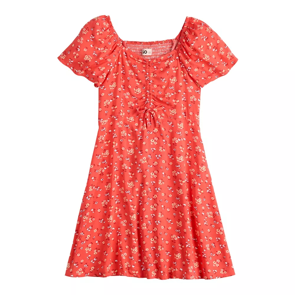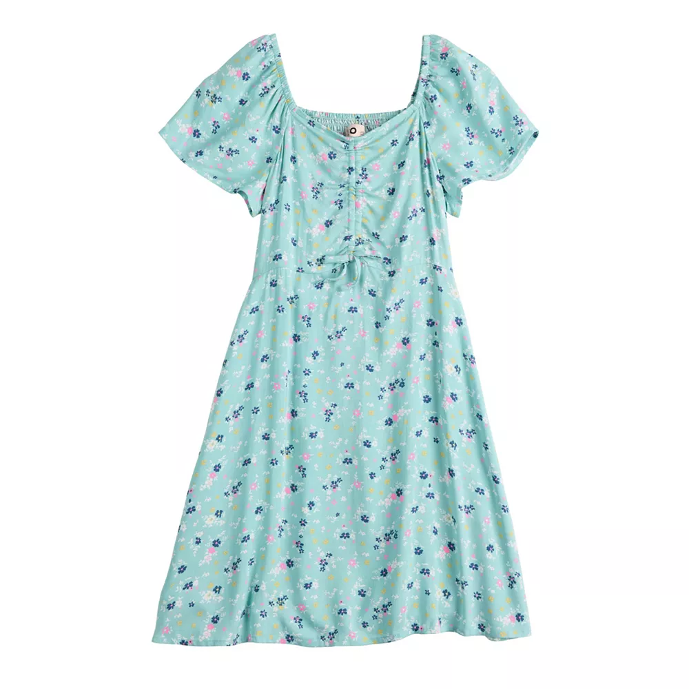 Feminine charm abounds on this girls’ ruched front flutter sleeve dress from SO.