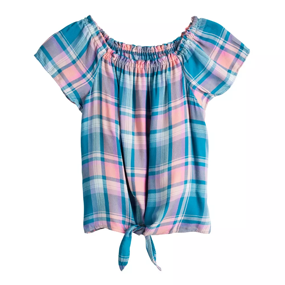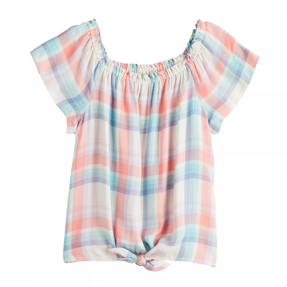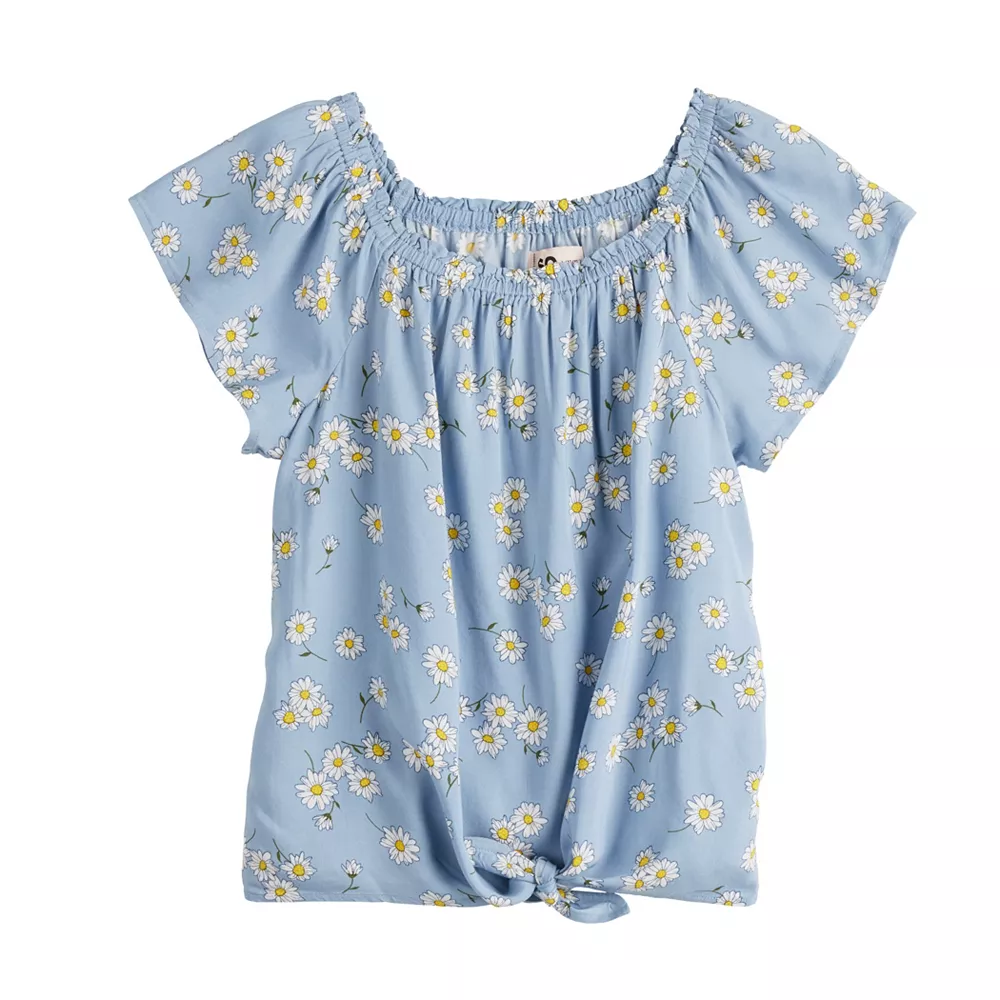 She’ll love the cute and casual look of this girls’ ruffled tie-front top from SO.