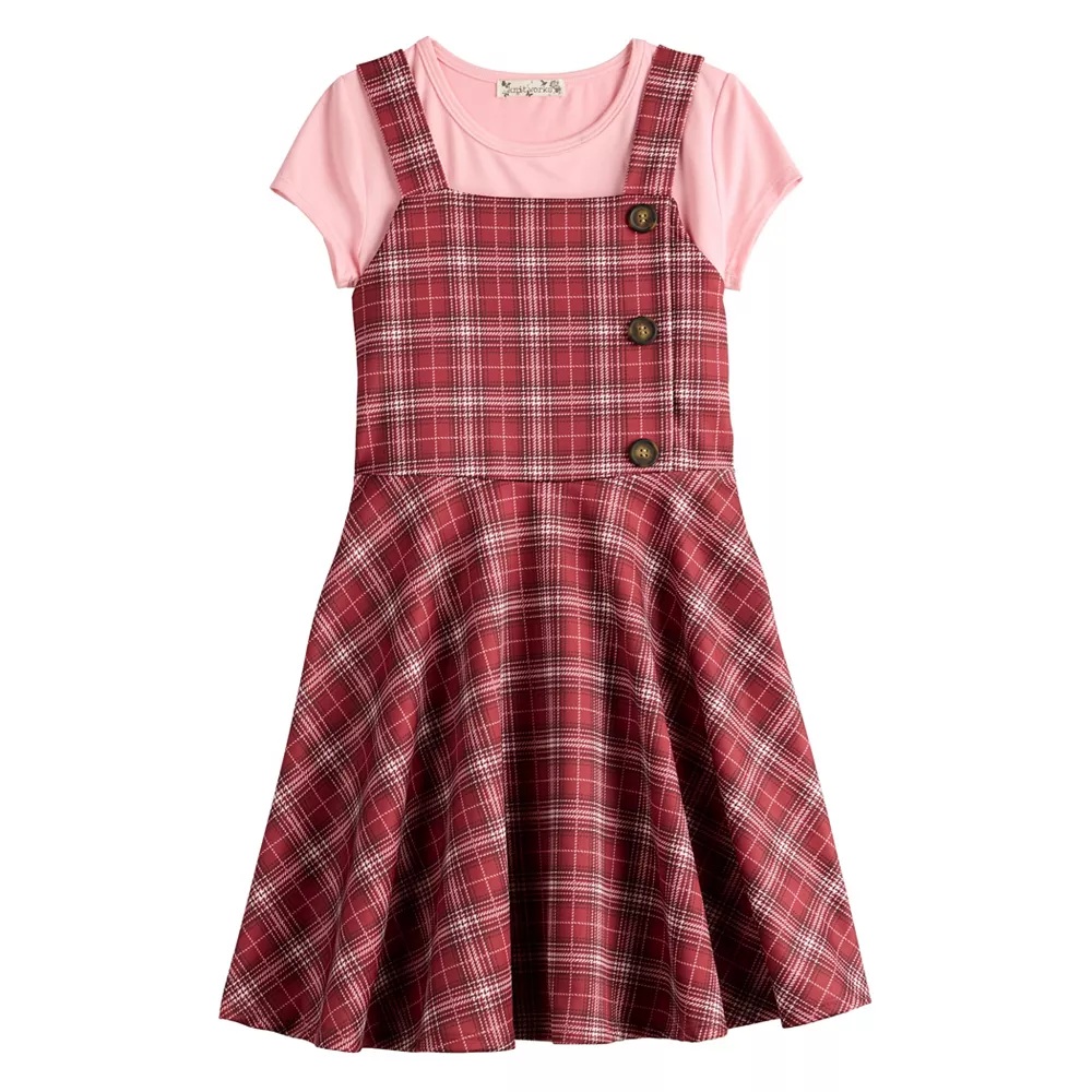 She’ll love the too trendy style of this girls’ Knit Works Pinafore Dress & Top Set.