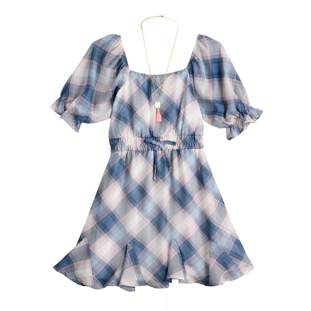 She’ll feel so boho-cute in this girls’ puff sleeve printed dress and necklace set from Three Pink Hearts.